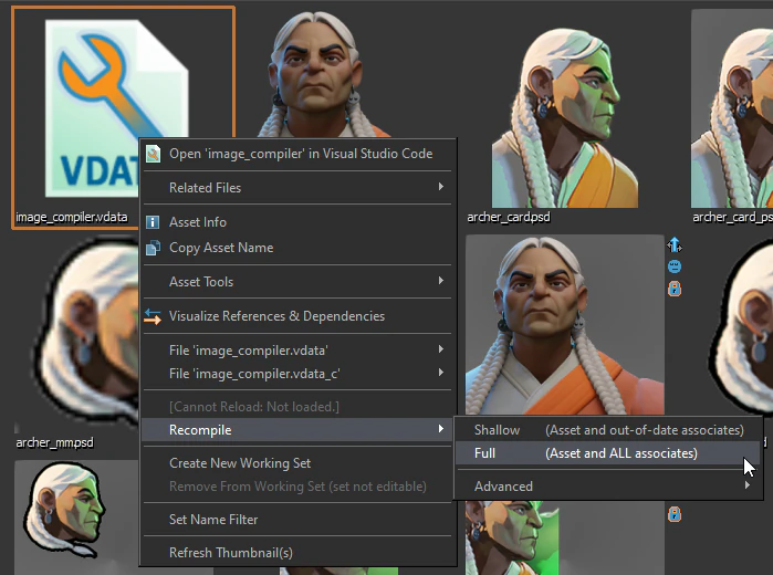 Asset Browser, right click on it and select “Recompile > Full”. Compilation of this file will recompile all referenced images to .vtex_c.
