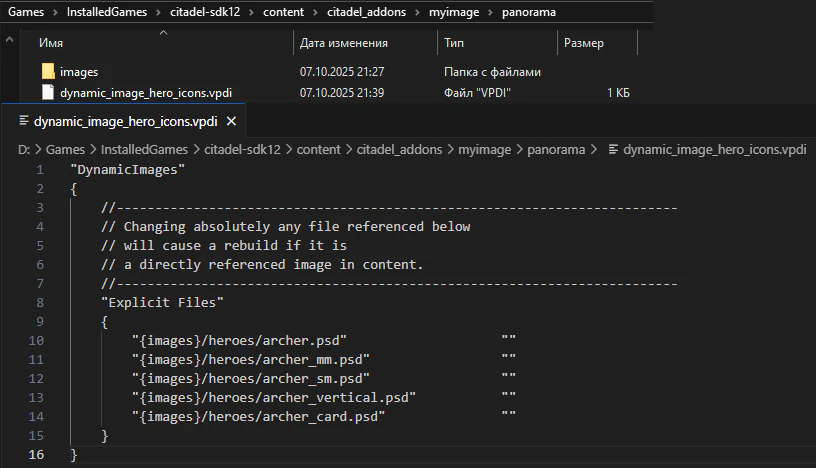 First, make a .vpdi file in the panorama folder of your addon (you can copy the example above). Then, define all of your images in the “Explicit Files” section ({images} is the panorama/images folder).
