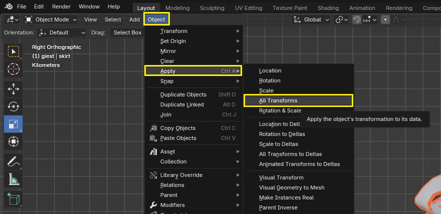 “Object>Apply>All transforms”