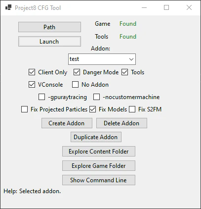 . This will open the Configuration Tool below, then choose your addon to launch in BinLegacy Tools mode. This mode is needed to view Hammer maps with particles enabled, with Fix Projected Particles selected.