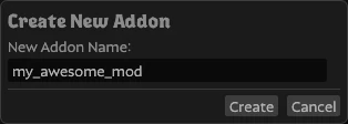 On the left side of the launcher is the “Addons” section. You can think of addons as projects, it’s recommended to create a separate addon for every mod that you make. To create an addon press the “Create New Addon” button and give it a name.